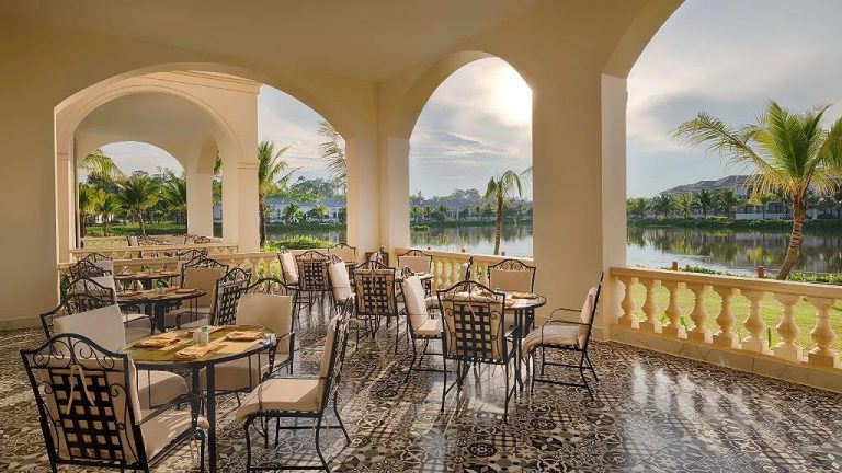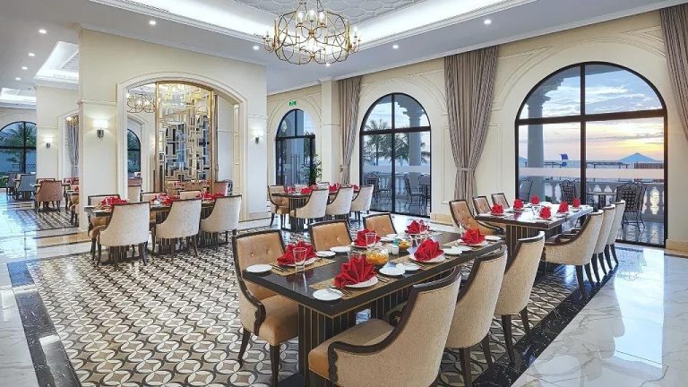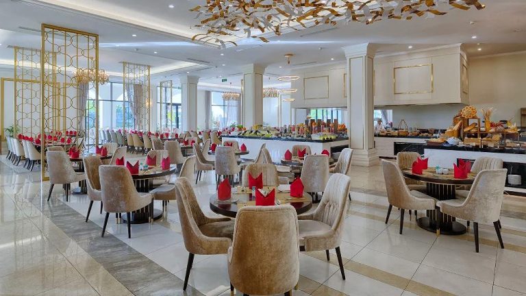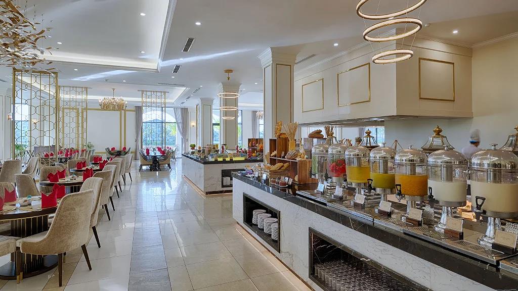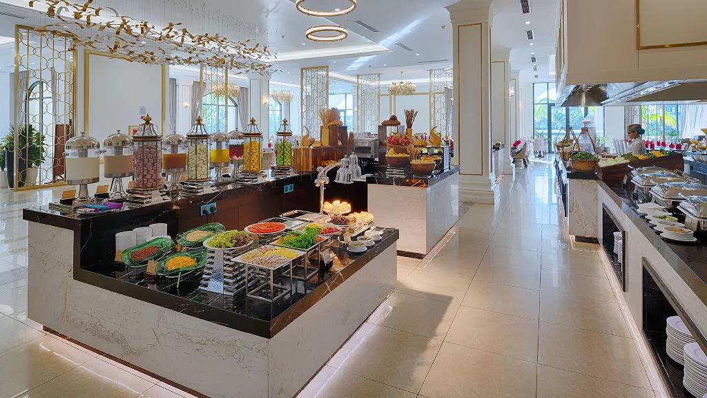 - Phục vụ bữa ăn buffet quốc tế tinh tế với không gian trong nhà hàng sáng sủa hoặc sân hiên ngoài trời.